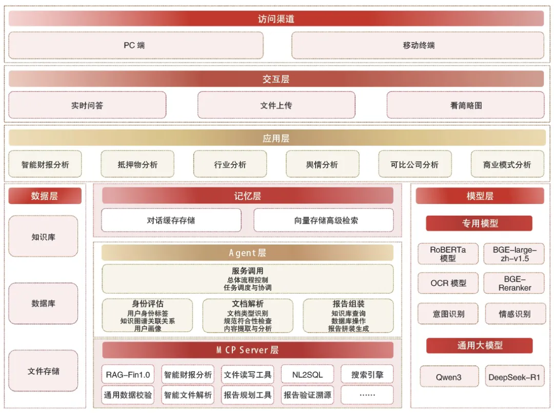 华夏银行围绕业务分析工具(Business Analysis Tools)、RAG相关工具(RAG-related Tools)、引擎工具(Engine Tools)、AI辅助工具(AI-assistant Tools)和数据/文件处理工具(Data/File Processing Tools),构建了MCP BREAD框架,将智能财报分析、RAG-Fin1.0、搜索引擎、OCR、数据核验、文件解析、文件读写等能力封装为MCP Server工具,使任何能够发起HTTP请求或执行本地命令的应用都可以作为MCP Client端调用MCP Server。MCP Server的标准化接口方便跨平台应用,从而以统一、敏捷的方式调用服务端的AI能力,不仅可降低AI应用的开发门槛,还可避免重复开发。需要注意的是,在此过程中,对于智能财报分析此类高频、耗时的MCP Server工具需做好缓存、异步处理等;文件读写这类涉及数据权限的MCP Server工具需注意权限控制及安全性管控等。