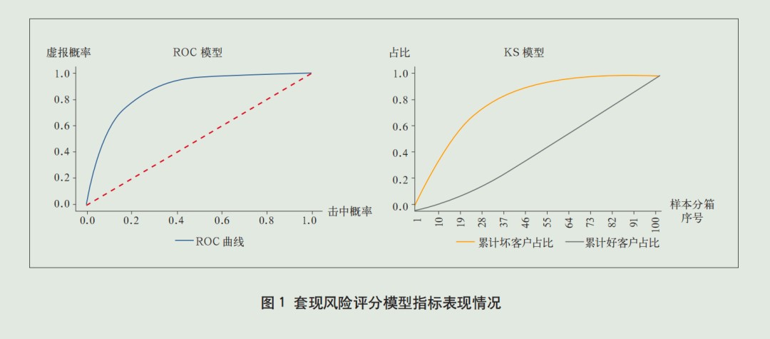 中国银行充分利用信用卡海量历史交易数据,通过机器学习深挖套现行为特征,输出客户套现风险评分模型,进而开展精准、及时的风险预警。模型开发过程中,中国银行以历史套现客户为目标客群(坏客户),选取2021年9—11月交易记录作为开发样本,随机抽取70%作为训练集,30%作为验证集,以信用卡交易特征为输入变量,共计衍生1000多维变量,通过逻辑回归算法驱动机器自动演算,最终得出客户套现风险评分,分值越高,持卡人套现倾向越高;经过多轮迭代调优,最终选择13个可解释性强、区分度高的变量构成模型。从模型评价指标上看,模型的KS值为0.59,区分度显著;AUC值为0.88,模型准确度达到0.94;且通过模型内测试集验证和多个跨时间段验证,模型的PSI值均在0.01以下,具有良好稳定性。套现风险评分模型指标表现情况如图1所示。