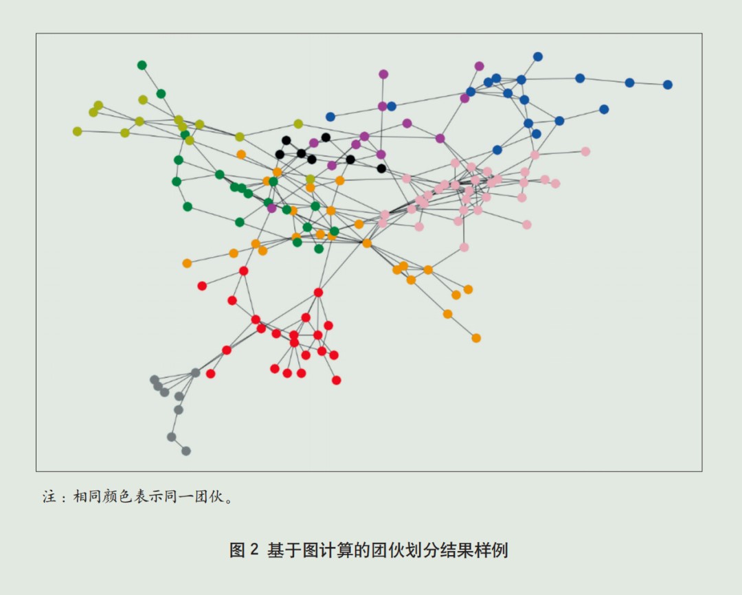 中国银行利用网络图谱的构建方式,对套现客户、套现商户之间的交易关系建模,识别客户与商户、客户与客户、商户与商户之间的关联关系,可清晰展现套现团伙关系,防范业务集中性风险。模型开发过程中,中国银行选取2022年12月交易记录作为开发样本,从持卡人和商户两个角度构建连通图,分别以持卡人和商户作为顶点,以持卡人或商户之间的共同交易关系构成顶点之间的边,以共同交易关系出现的次数作为边权;同时借助社区发现算法,在无监督模式下,进行亿级交易数据迭代优化,完成团伙风险模型建模。通过模型输出,中国银行有效识别出套现客户团伙200余个,套现商户团伙400余个。基于图计算的团伙划分结果样例如图2所示。