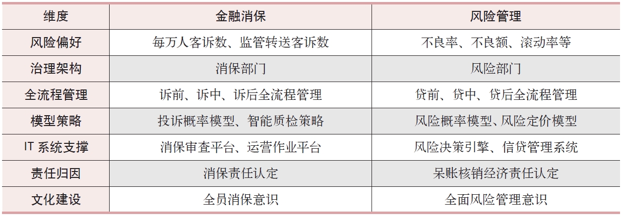 在风险管理领域,信用风险是因客户违约而引起的风险,可通过客户违约概率模型进行信用风险的计量预测。客户投诉也是一个概率事件,可以被计量、被预测。对照风险管理实践,金融机构可以创新开发出客户投诉概率模型,提前预测和锁定高投诉风险客户,并据此提供差异化服务。以此为起点,消保工作守正创新可以打开新思路,即充分借鉴全面风险管理框架理念和实践。C O S O E R M 框架强调将风险管理与企业战略、组织文化和业务流程深度融合。巴塞尔协议框架强调风险必须被合理识别、准确计量、充足覆盖、动态监控。两个框架均以全面性和科学性著称,为金融机构风险管理工作提供了方法论和工具,已成为全球金融业稳健经营的两大基石。金融消保与风险管理多维度对照借鉴情况见表1。